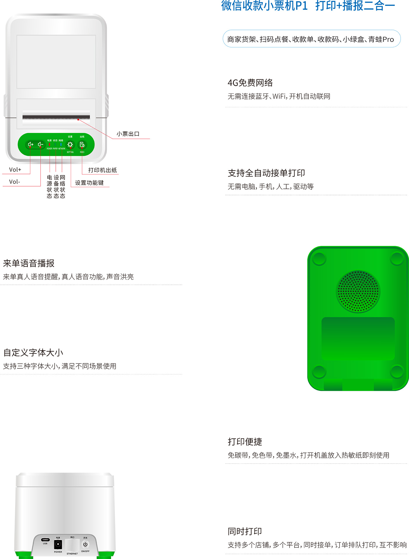 產(chǎn)品概述:微信收款小票機(jī)P1集接單、打印對賬小票、收銀機(jī)外接打印設(shè)備于一身,不受距離限制,不需要連接電腦、安驅(qū)動,為餐飲外賣、生鮮配送、快遞、物流、醫(yī)院、政務(wù)等各個領(lǐng)域提供票據(jù)服務(wù)